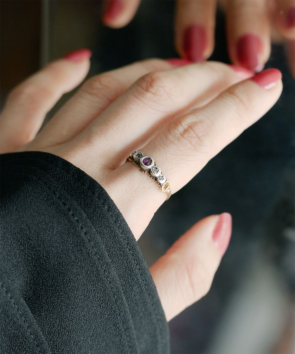 - 戒環:純14K金(金色部分)、純銀(銀色鑲嵌寶石部份)