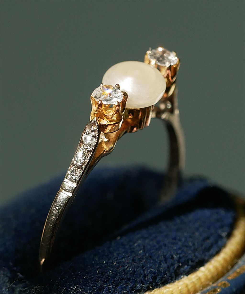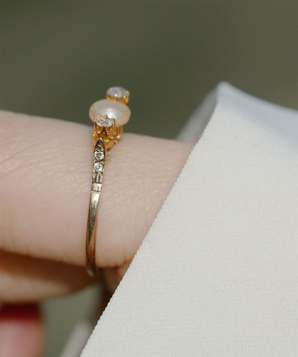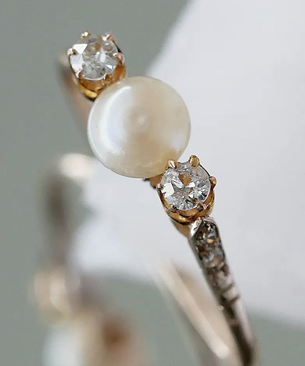 - -上部戒臺爪鑲珍珠與鑽石部分為黃K金色,戒環部份的色澤偏白金