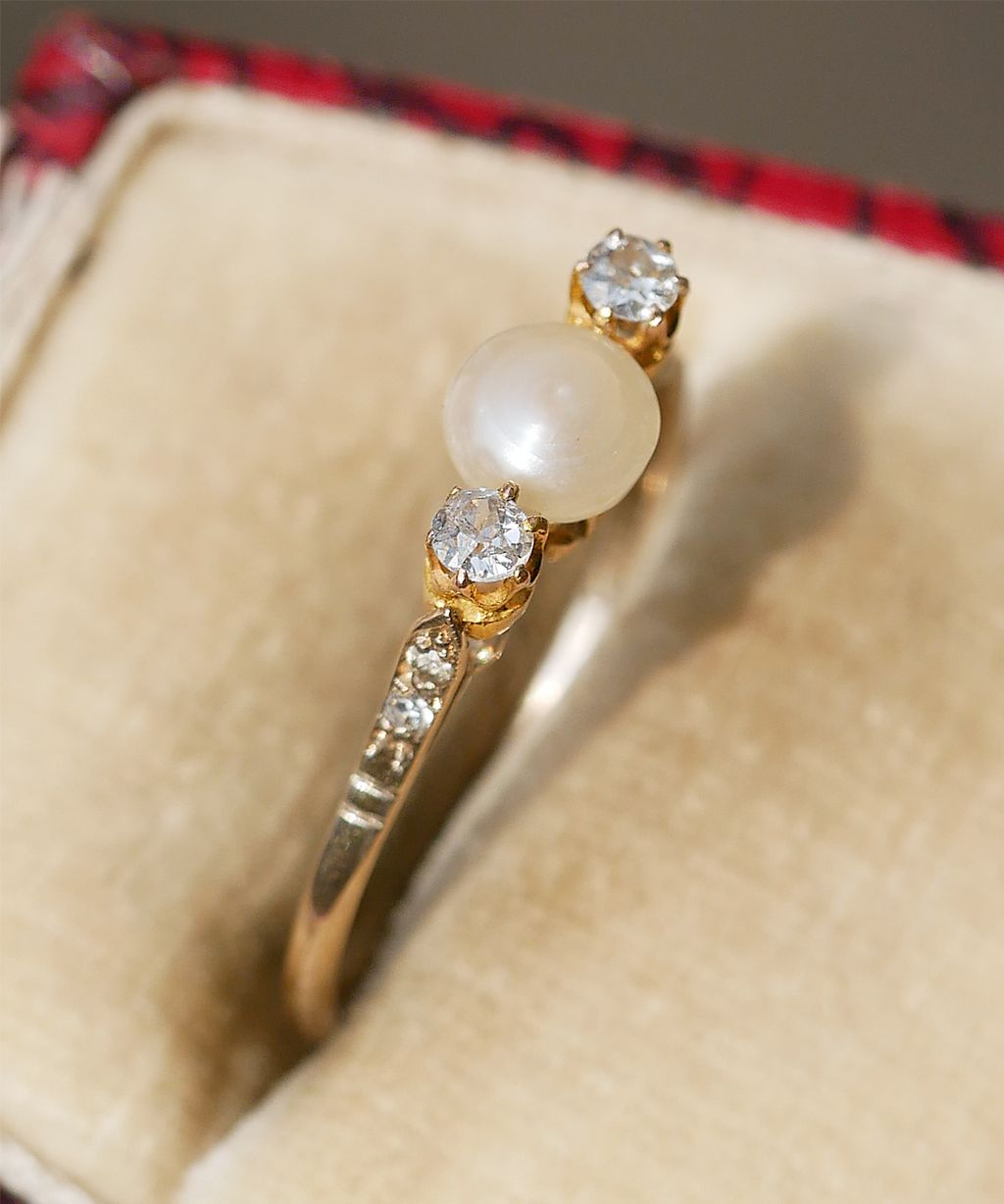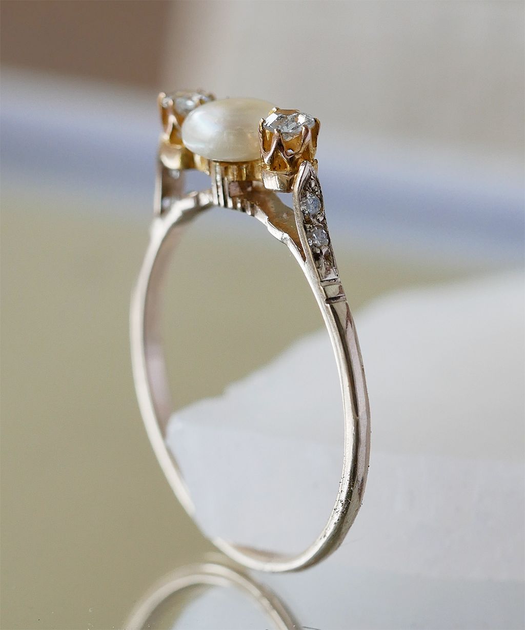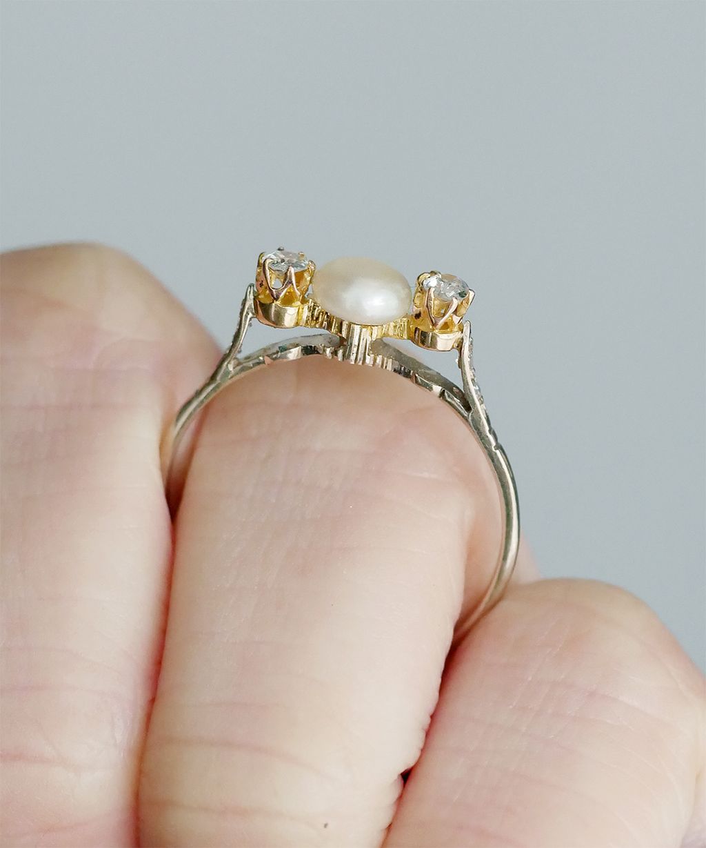 - -上部戒臺爪鑲珍珠與鑽石部分為黃K金色,戒環部份的色澤偏白金