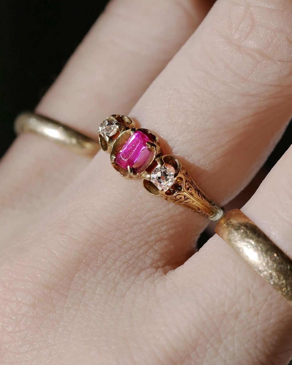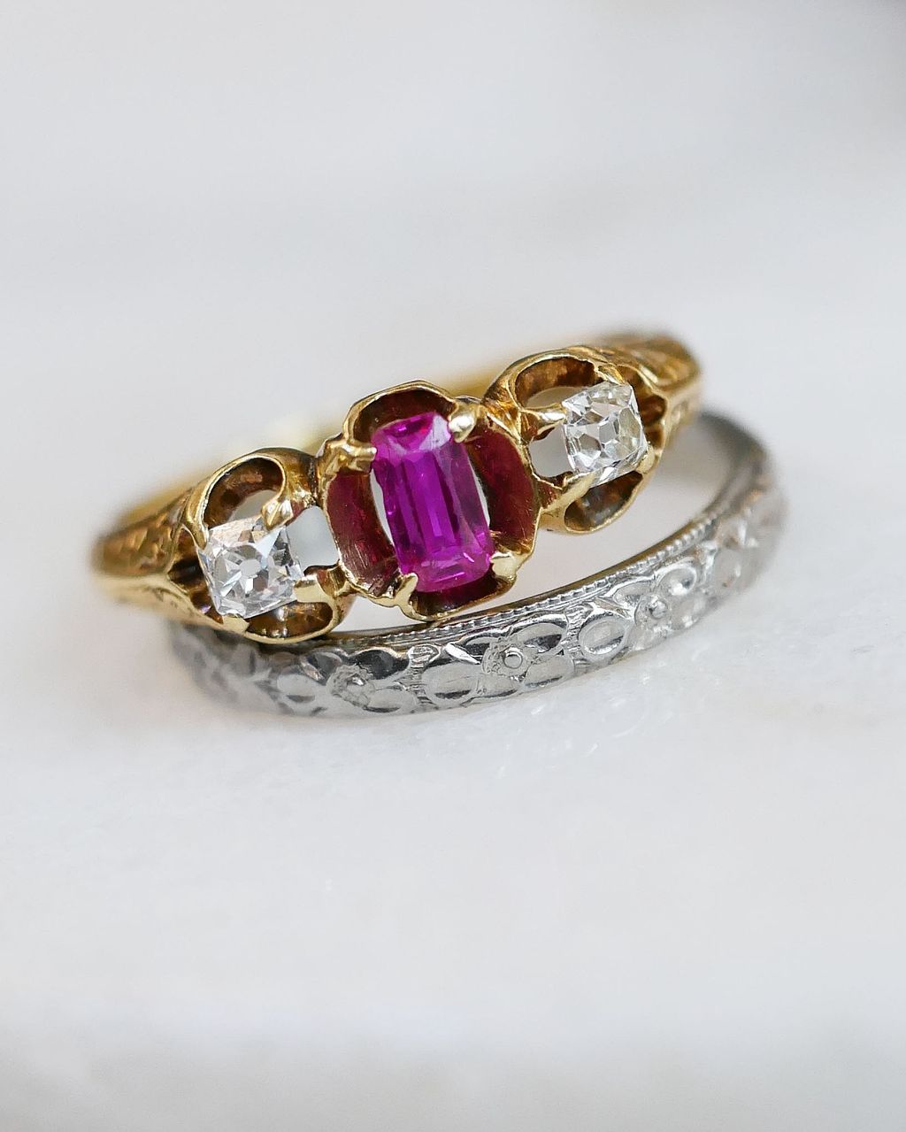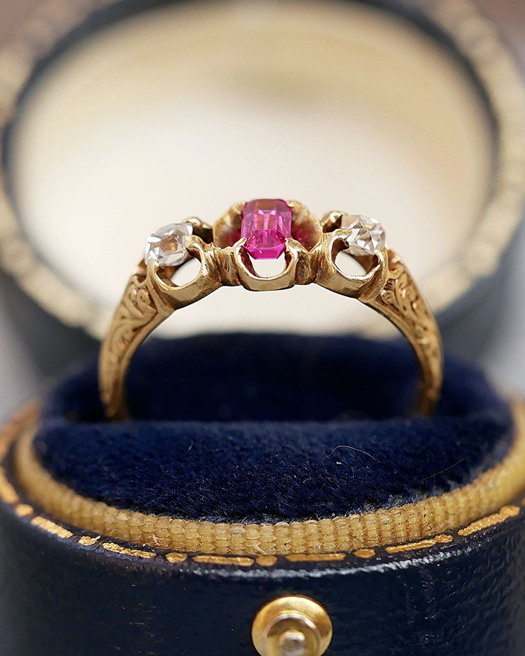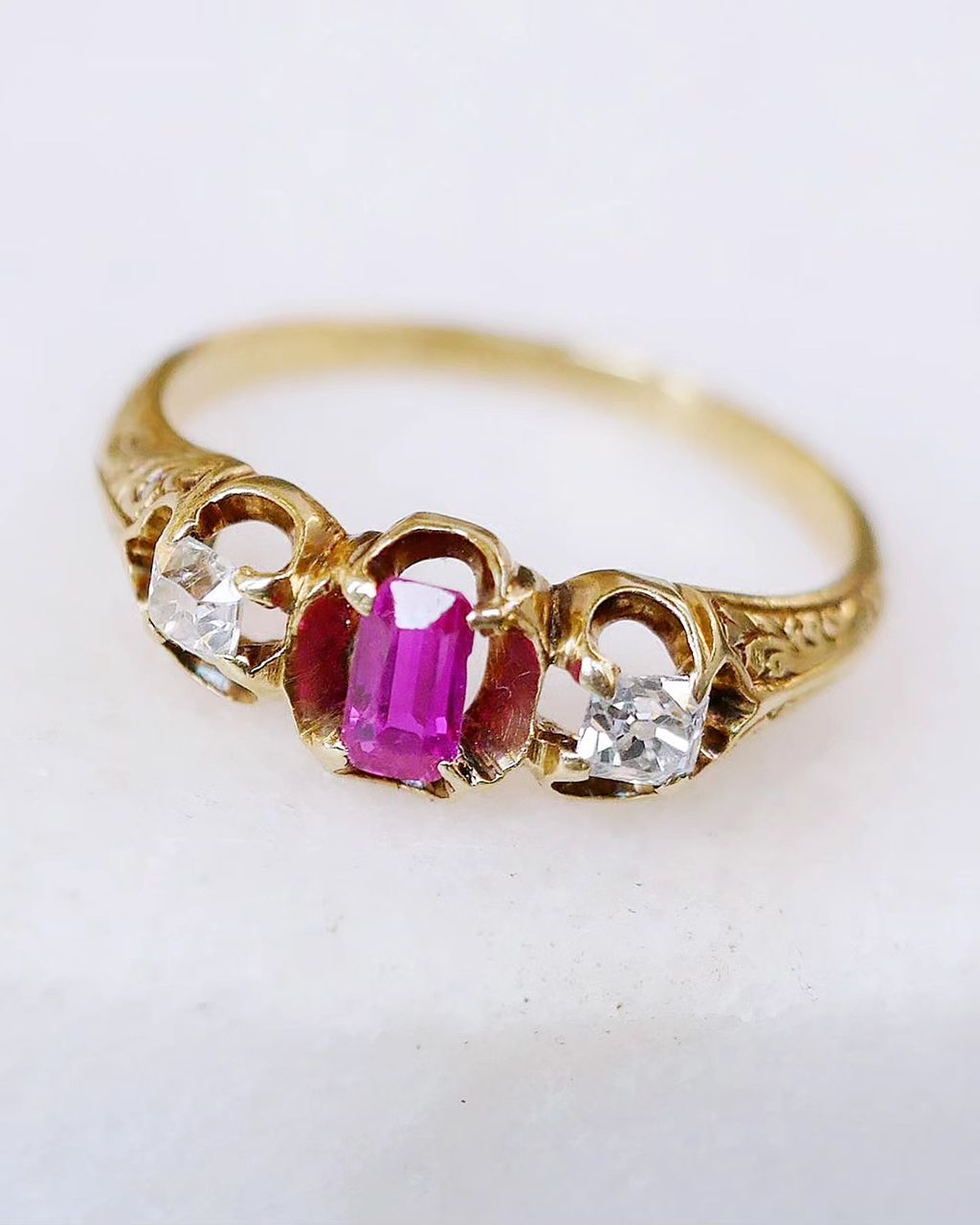 - - 礦石完整、雙側鑽石良好、僅主石細微歲月痕跡